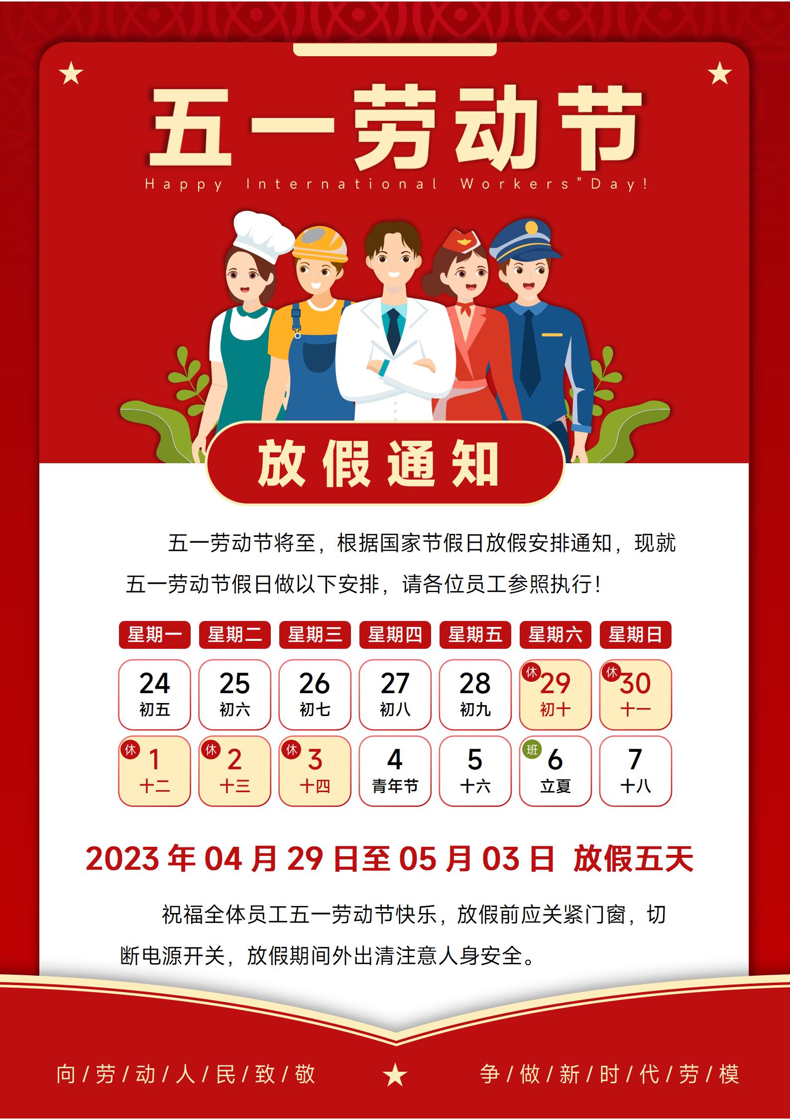 祝福全體員工五一勞動節快樂,放假期間外出清注意人身安全。