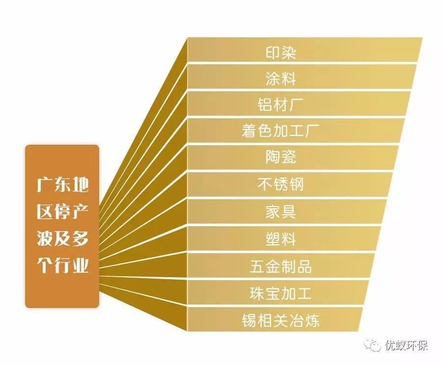 廣東地區大片相關企業停產,波及多個行業,印染,涂料,鋁材廠、著色加工廠、陶瓷、不銹鋼、家具、塑料、五金制品,珠寶加工,錫相關冶煉、加工等排污嚴重行業是重點整治領域。