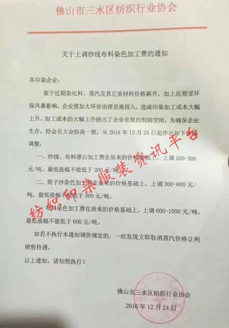 2、佛山,普寧地區印染染費紛紛漲價!