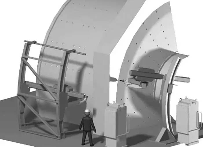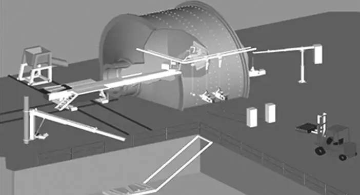 使用換襯板機械手對磨機進行換襯板作業無需卸去筒內鋼球,也不必排空礦石,只要礦石和鋼球面低于磨機孔口下沿 300 mm 左右即可作業。磨機停止運轉制動定位,移去給料或排料溜槽,使換襯板機械手吊裝或自行走近工作位置,將機座固牢于地面后,開動支承橫梁進入磨機筒體內的工作位置,即可進行換襯板作業。拆下的舊襯板只需用掛在抓具頭部的鏈鉤吊上小車送出筒外,新襯板用小車推入筒內,用抓具鉤牢后翻轉一個角度,送達安裝位置再經過上下左右調整角度后將其就位,插入螺栓,在筒體外由工人操縱風動搬手固定。新襯板通常是沿筒體水平線一層層裝換,視襯板尺寸的大小,每換裝約 3~4 層,通過磨機微拖動裝置將筒體轉動相應角度后制動,換襯板繼續進行。筒體轉動時橫梁不必退出,出于安全考慮,人員必須全部撤出筒體。