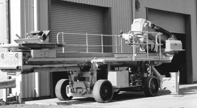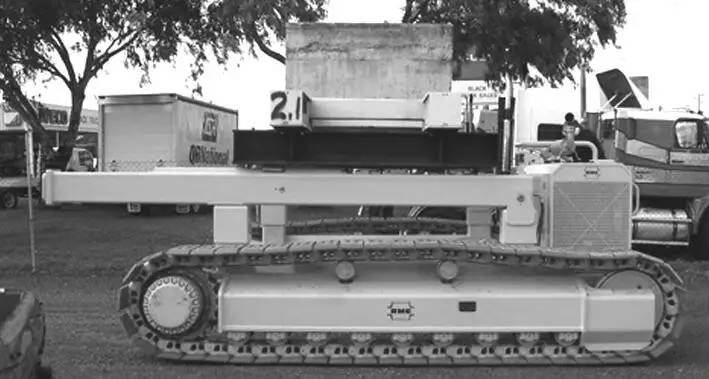 (2) 地面自行式 自行式機架分為輪胎式和履帶式兩種,如圖 3 所示。輪胎行走機架設有液壓缸支承的行走輪 (不充氣膠輪) 和液壓馬達驅動的驅動輪,由存放地走至工作位置后,液壓缸卸荷放至地面并被固定。