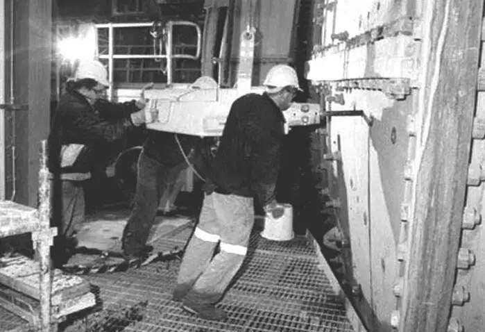 通過換襯板機械化來減少非運轉工時取得了明顯效果。早在 1979 年的明尼蘇達礦業設備年會上即顯示出,換襯板機械手的使用可使磨機的非運轉工時減少 46%,而美國漢納礦業公司的使用記錄證實這種減少可達 45% ~ 50%,并減少了勞動力。