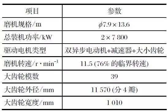 該項目中配置的 Φ7.9 m×13.6 m 溢流型球磨機采用的是雙驅齒輪驅動系統(tǒng),其主要參數如表 1 所列。