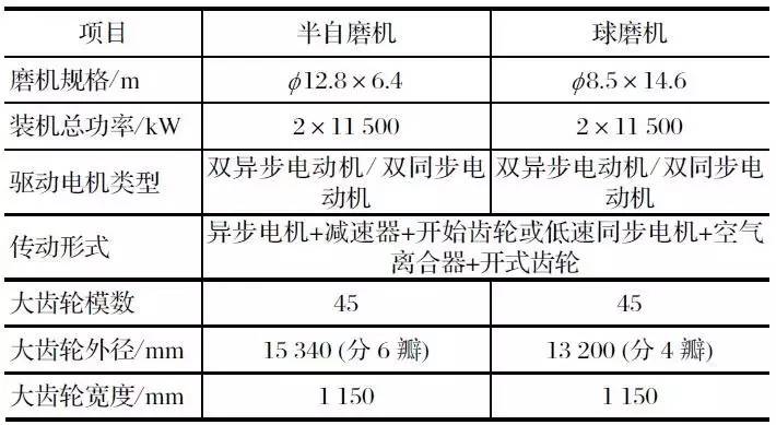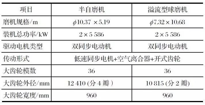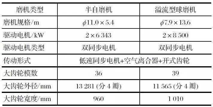 該項目是中信重工設計制造的雙驅溢流型球磨機和雙驅半自磨機,2010 年 12 月 2 臺磨機正式投產,其傳動部分主要參數如表 2 所列。