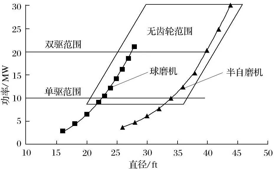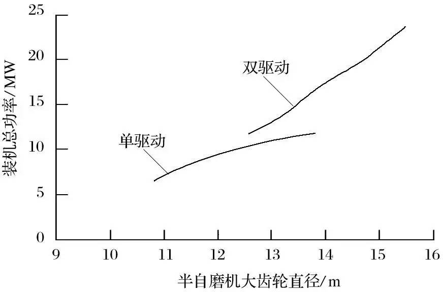 圖7 半自磨機大齒輪直徑和裝機功率