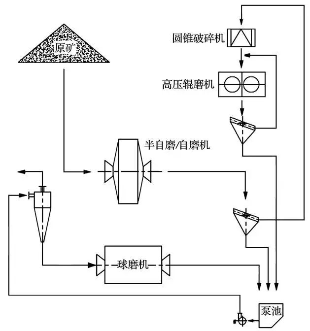 圖2(b) 所示為高壓輥磨機作為頑石破碎機,輥壓產品分級后進入球磨機工藝。該工藝頑石經圓錐破碎機破碎后進入高壓輥磨機,輥壓產品篩分后,篩上產品返回高壓輥磨機破碎,篩下產品給入旋流器給礦泵池。該工藝因頑石破碎后不返回自磨/半自磨機,可以釋放自磨/半自磨的產能,但多了一次篩分工藝,流程相對復雜,適合輥壓后產品中細粉含量較多的情況。